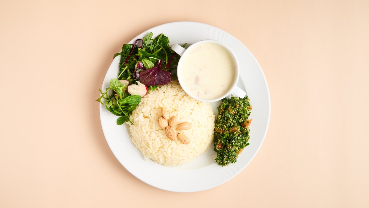 Zartes Hähnchengeschnetzeltes in aromatischer Joghurtsoße, serviert mit Taboule und Fatousch, dazu Reis und gebratene Mandeln.