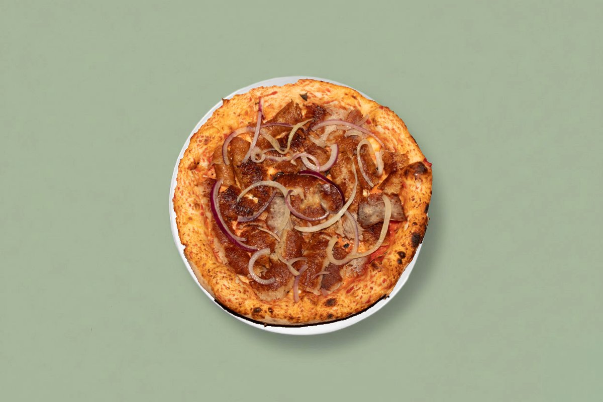 Mit Tomatensoße, Dönerfleisch, rote zwiebeln und Knoblauchöl