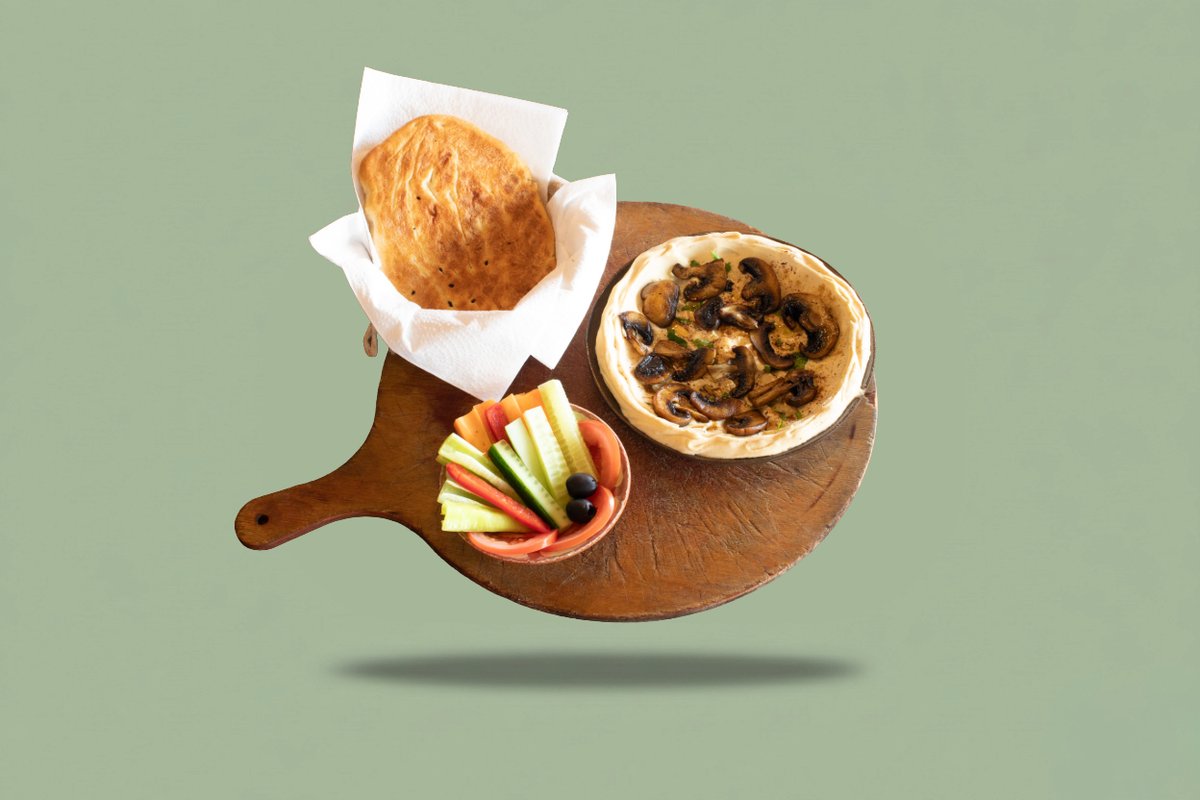 Hausgemachter Hummus, getoppt mit frisch gebratenen Champignons und feinen Gewürzen. Dazu warmes Fladenbrot und frisches Gemüse. Mild, cremig und vollmundig im Geschmack.