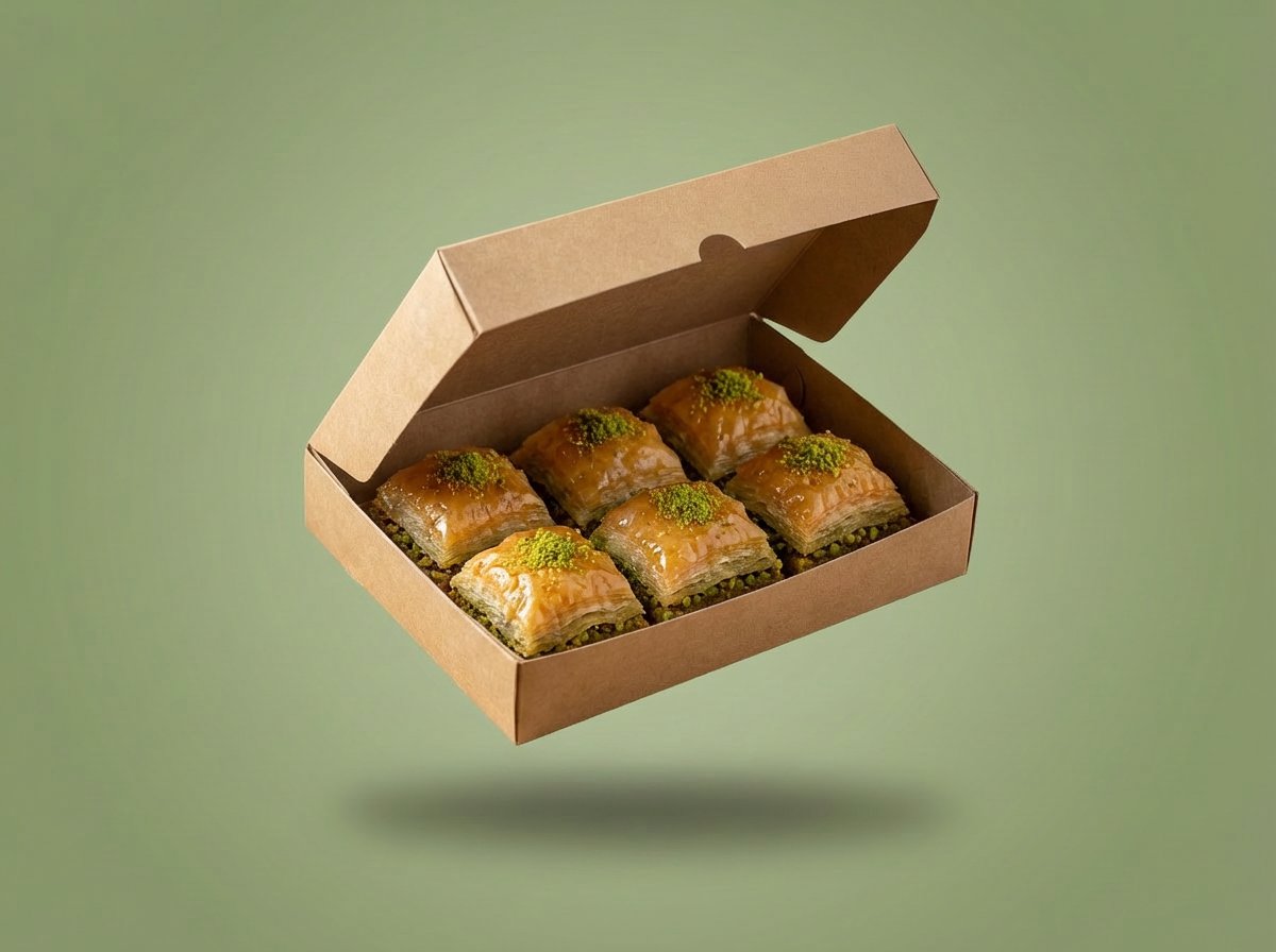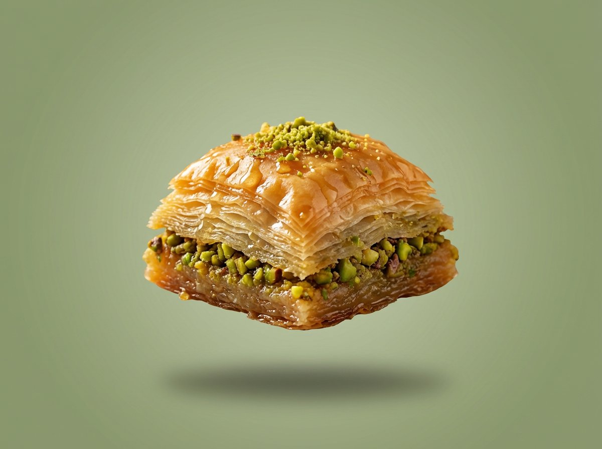 Knusprig gebackene Blätterteigschichten, gefüllt mit fein gehackten Pistazien und veredelt mit einem zarten Honigsirup. Außen goldbraun und leicht karamellisiert, innen saftig und nussig – ein klassisches orientalisches Dessert für den perfekten süßen Abschluss.