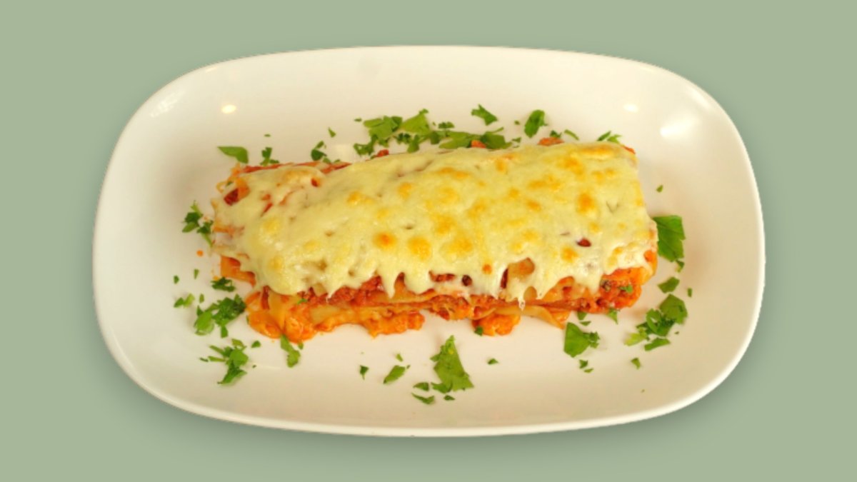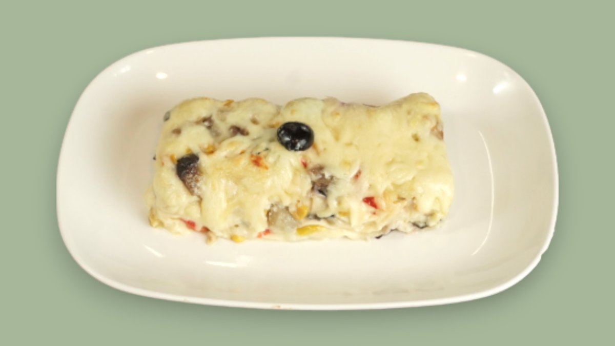 Vegetarische Lasagne mit Oliven, Mais, Aubergine und Paprika in feiner Tomatensauce, verfeinert mit cremiger Bechamelsauce und goldbraun überbacken – vollmundig und aromatisch.