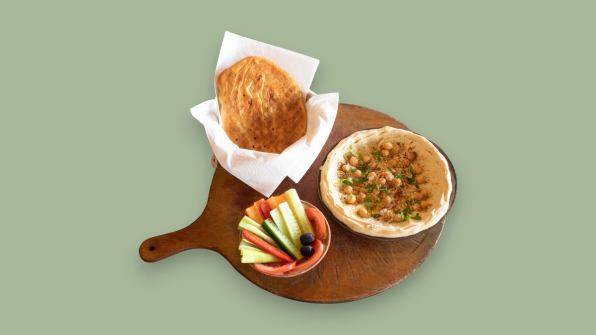 Cremiger hausgemachter Hummus, verfeinert mit ganzen Kichererbsen, Olivenöl und orientalischen Gewürzen. Dazu warmes Fladenbrot und frische Rohkost. Ein leichter, aromatischer Klassiker für zwischendurch.