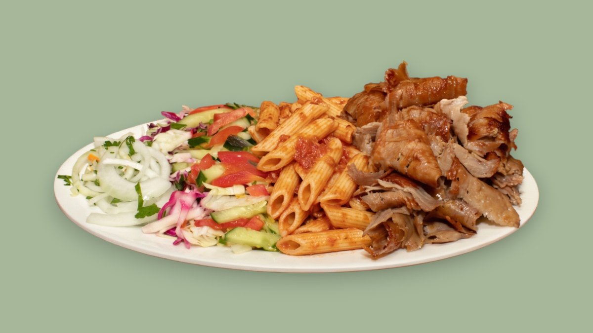 Mit Fleisch deiner Wahl, Nudeln, Salat und Soße deiner Wahl