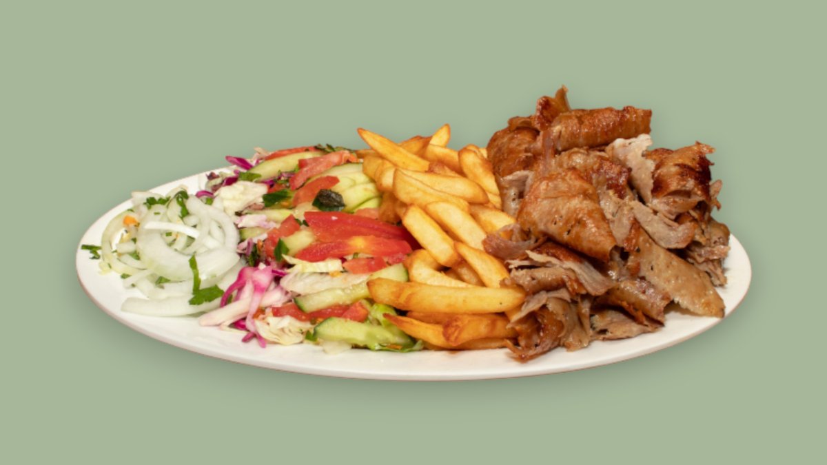 Mit Fleisch deiner Wahl, Pommes, Salat und Soße deiner Wahl