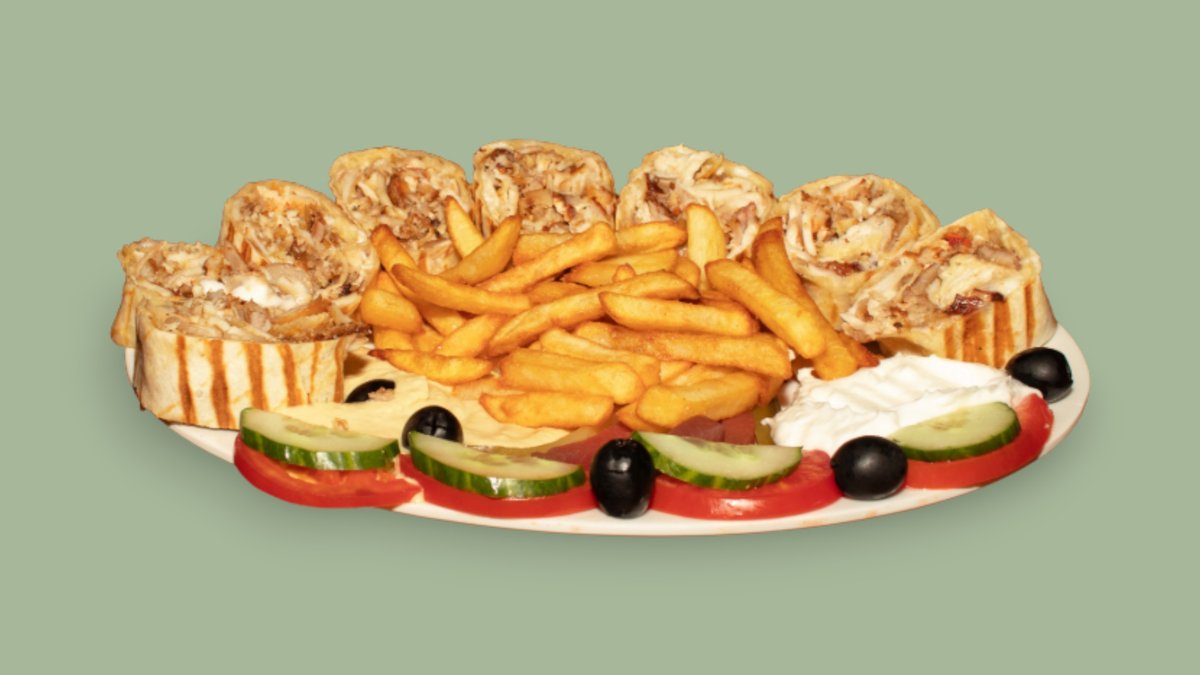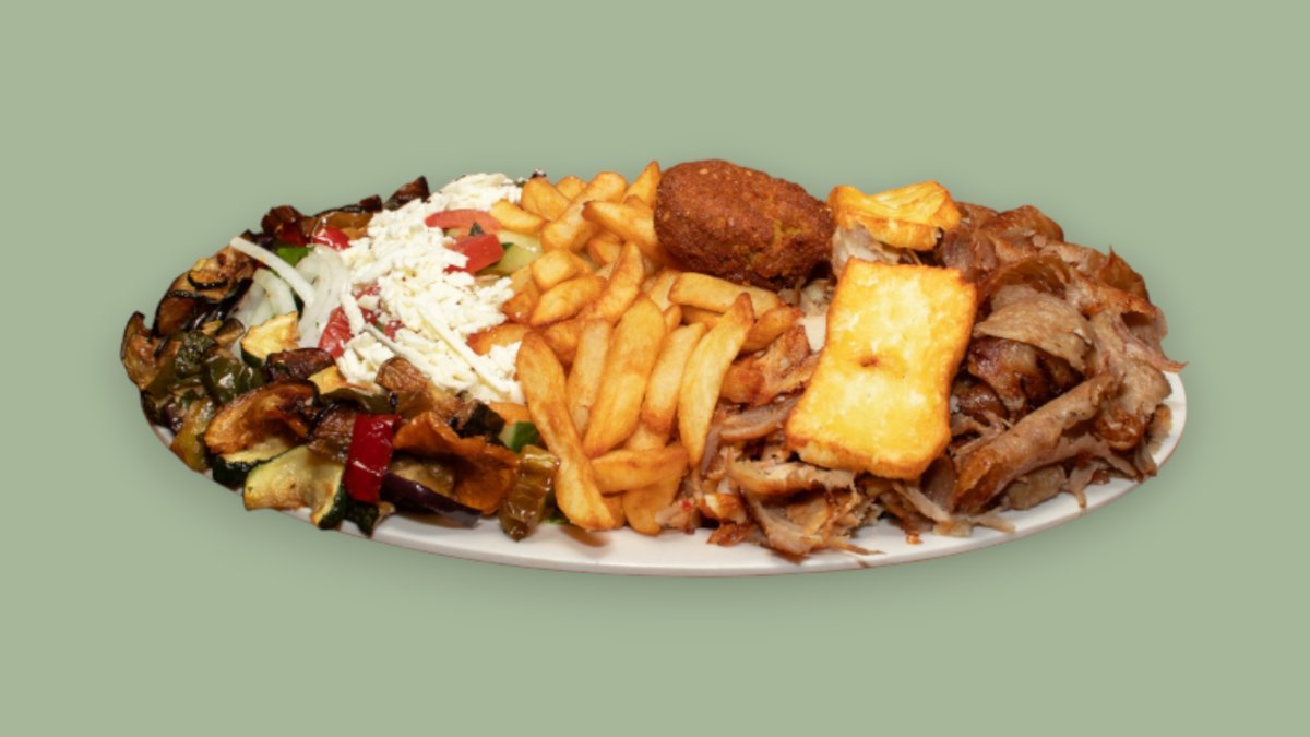 Mit Kalb&Hähnchen, Pommes, frittiertem Gemüse, Halloumi&Falafel, Schafskäse und Salat und Soße deiner Wahl