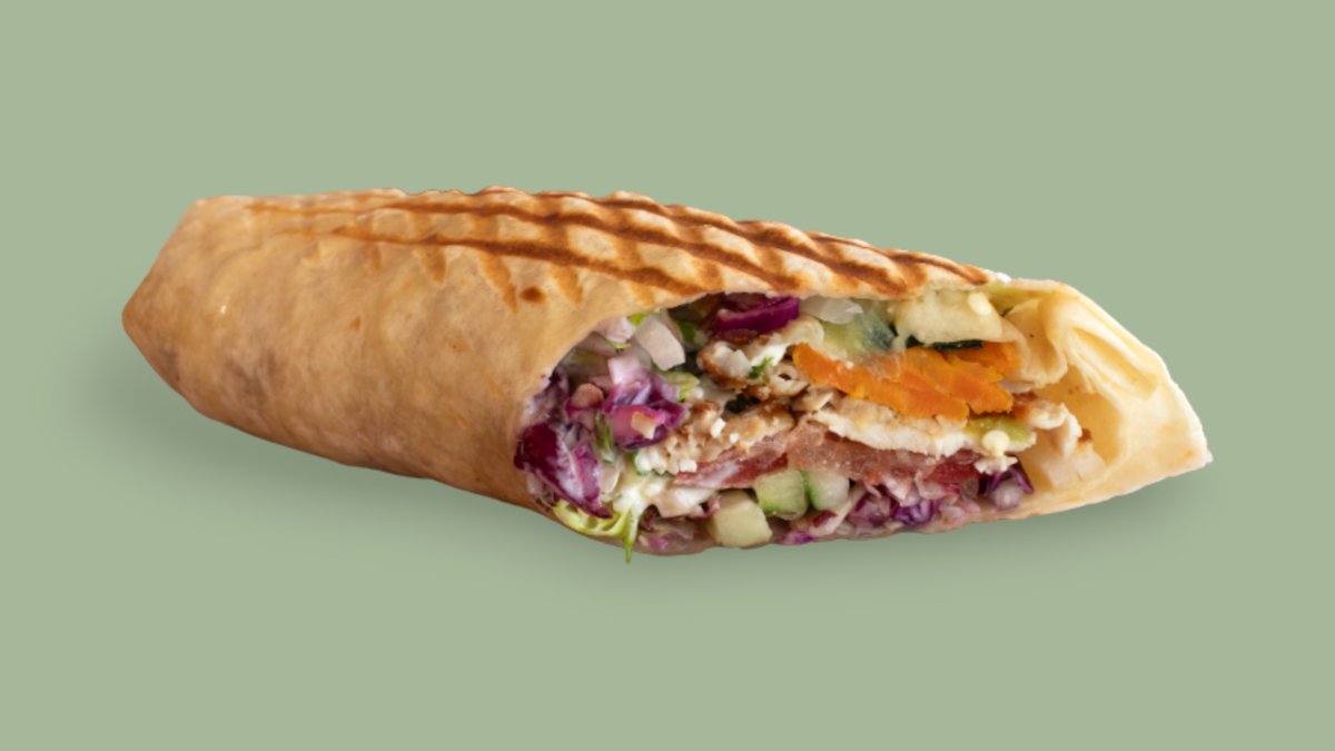 Schawarma-Rolle aufgeschnitten, Knoblauch-Creme, Pommes, Saure Gurken, Rote Bete und Granatapfel-Sirup