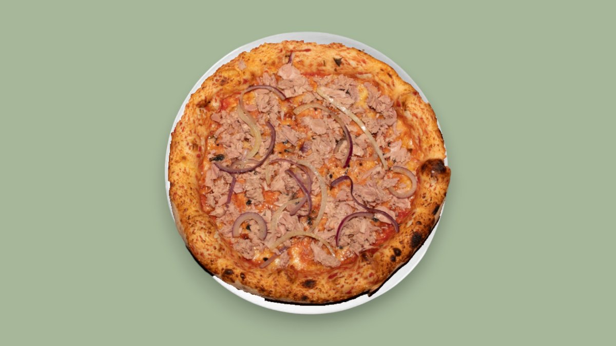 Mit Tomatensoße, Mozzarella, Thunfisch und rote Zwiebeln