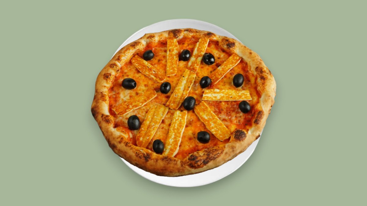 Mit Tomatensoße, Mozzarella, Halloumi, Oliven und Knoblauchöl