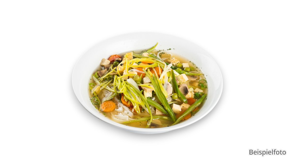 with fried prawns, boiled rice, vegetables, milk, coconut milk, peanuts, Asian herbs and a side dish of your choice