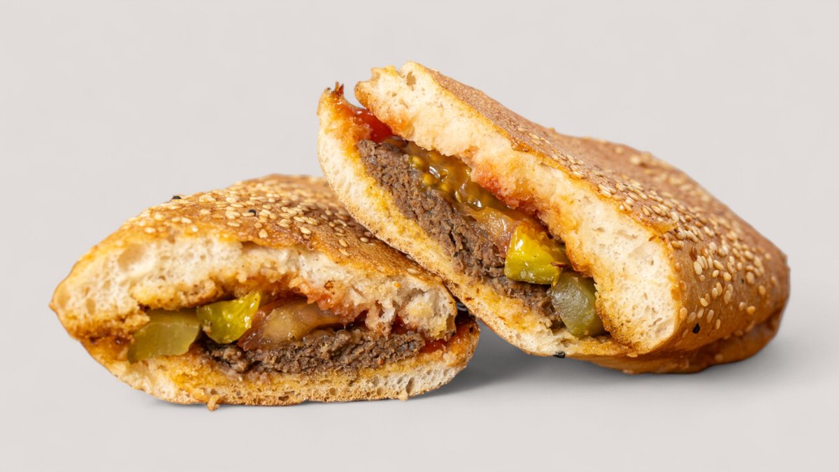 with baguette, seasoned beef, tomatoes, pickles and ketchup