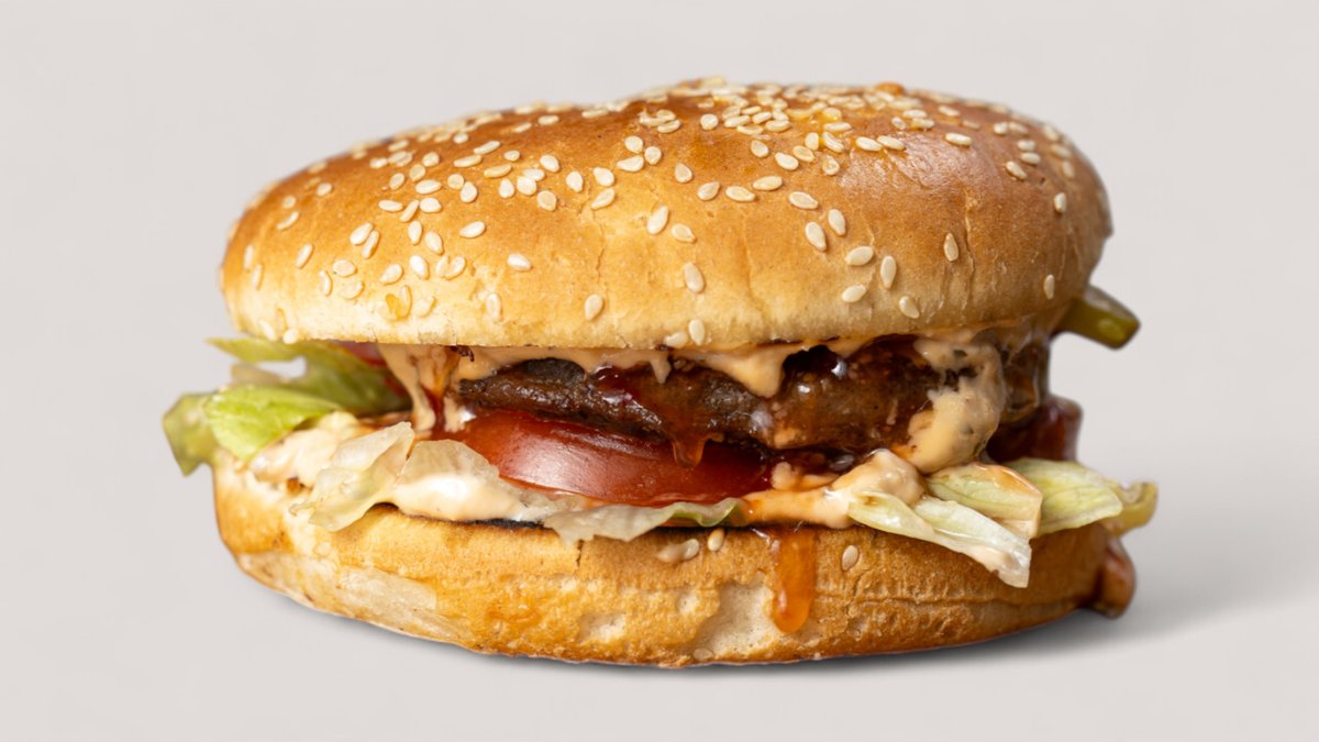 with chickano beef, iceberg lettuce, tomatoes, gherkins, onions and burger sauce