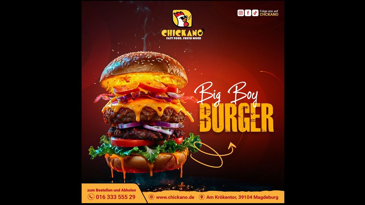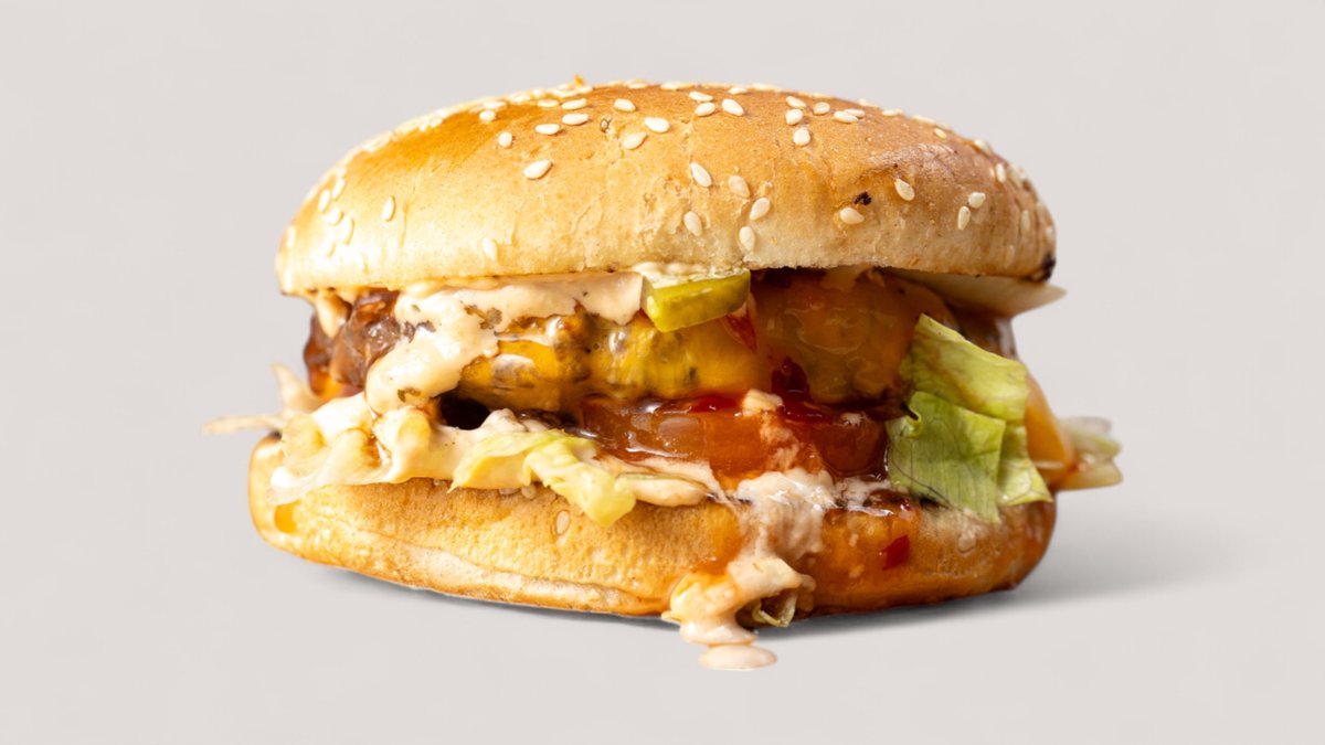 with 2x chickano beef, 2x cheese, iceberg lettuce, tomatoes, gherkins, onions and burger sauce