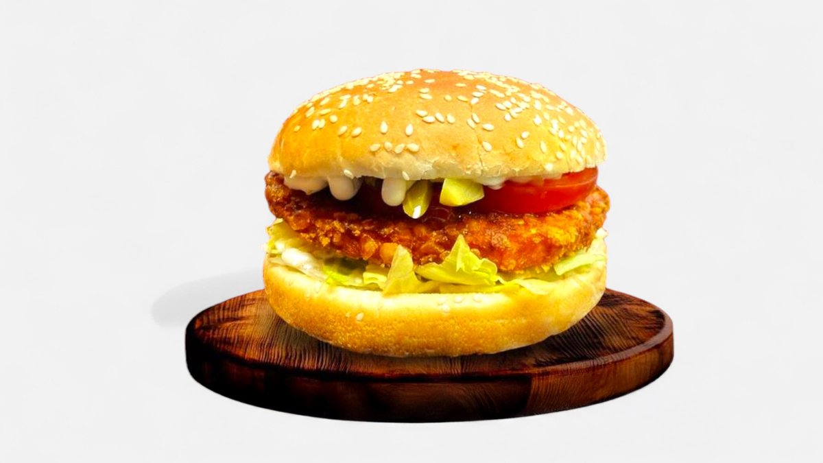 with crunchy chicken, iceberg lettuce or coleslaw, tomatoes, gherkins, mayonnaise and mango sauce