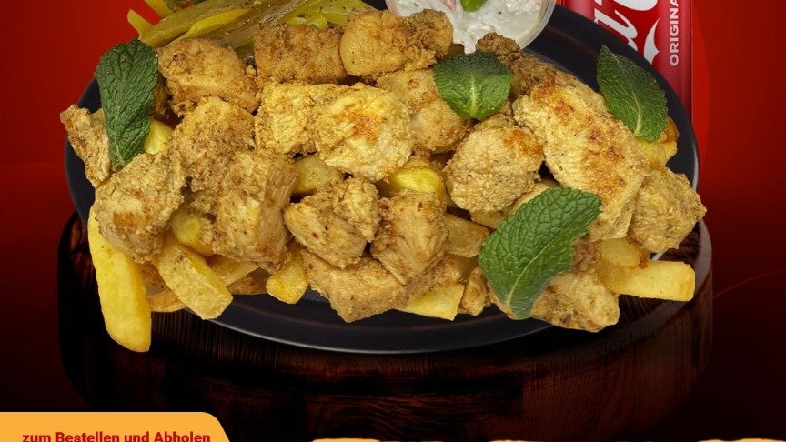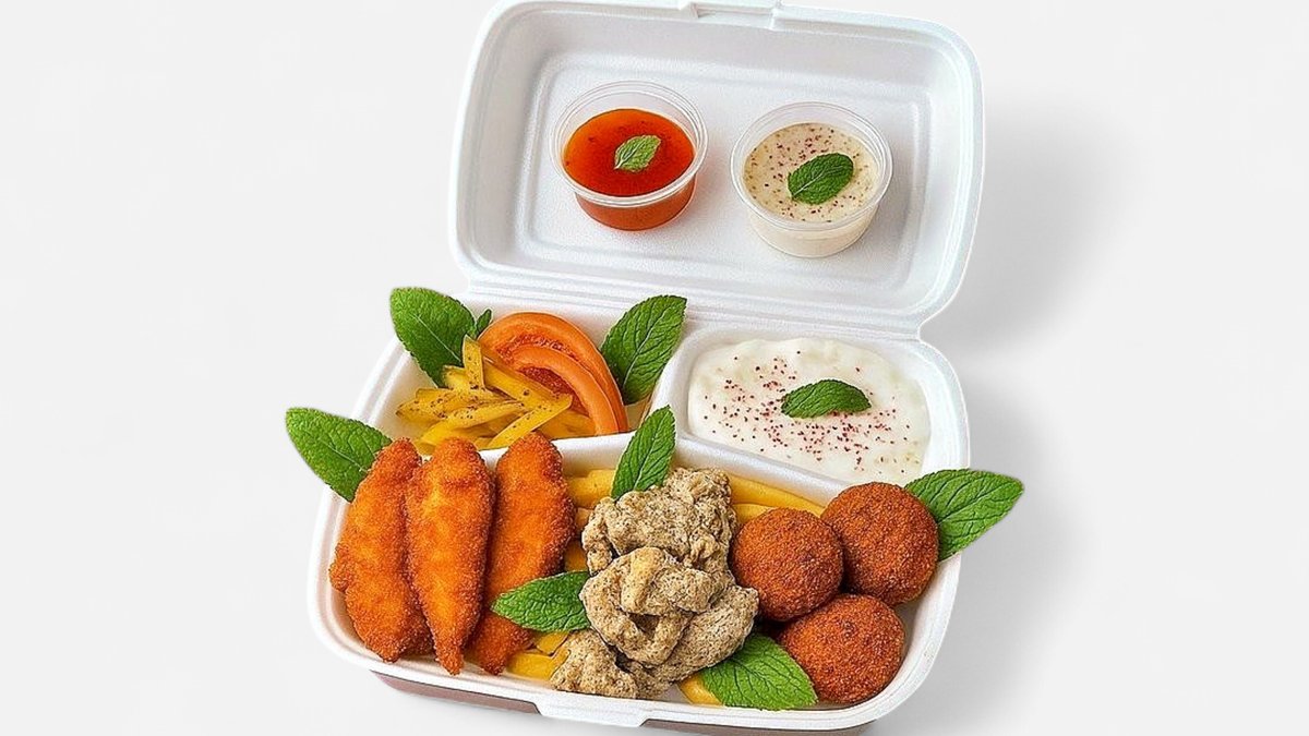 with schich tawuk, 3x crispy, 3x falafel, french fries, and sauce of your choice