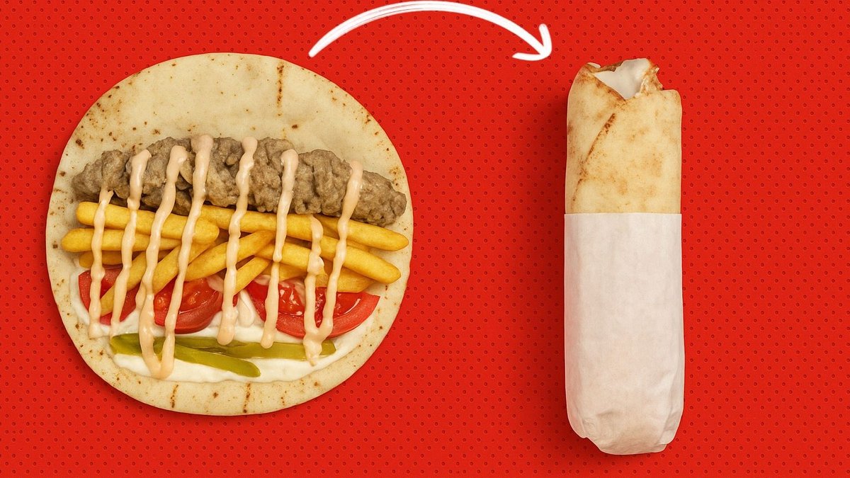 with flatbread, shich tawuk, tomatoes, French fries, pickles and garlic sauce