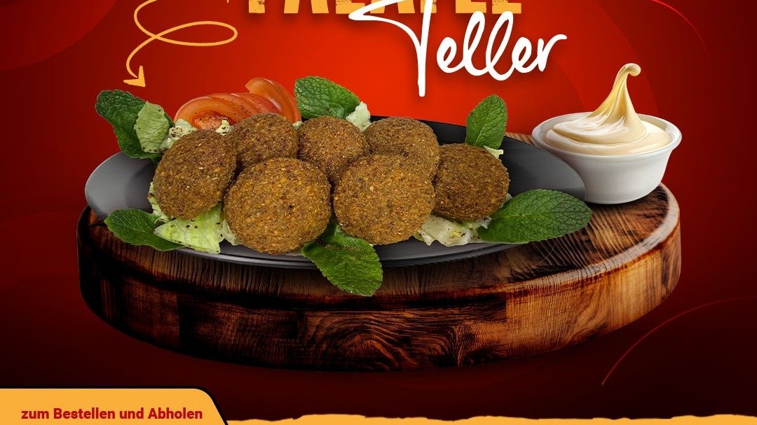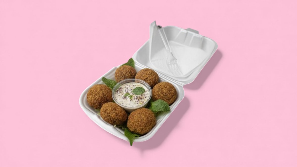 with 6x falafel, fries, tomatoes, iceberg lettuce, mint, pickles, sesame sauce, spices, slices of flatbread and a drink of your choice.