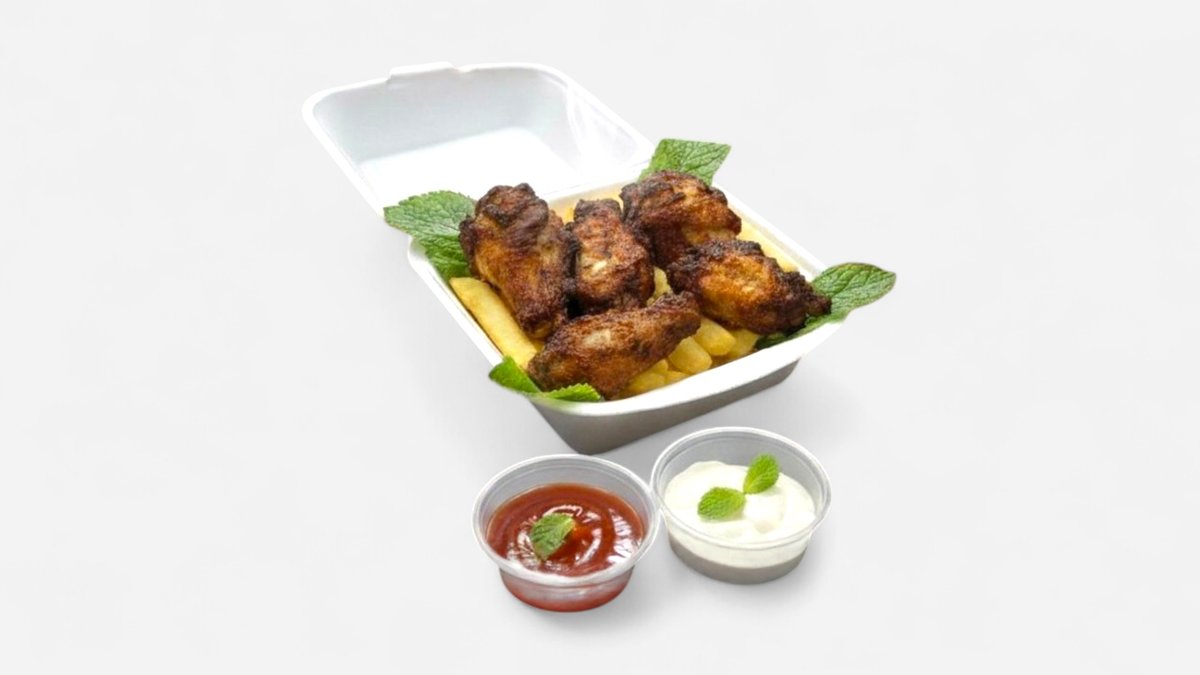 with 6 chicken wings, fries, tomatoes, pickles, garlic sauce, mayo and slices of flatbread