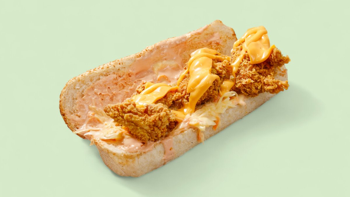 mit frittierten, knusprigen Hähnchenstreifen, scharfer Zinger-Soße, Salat, Cheddar und Mayonnaise