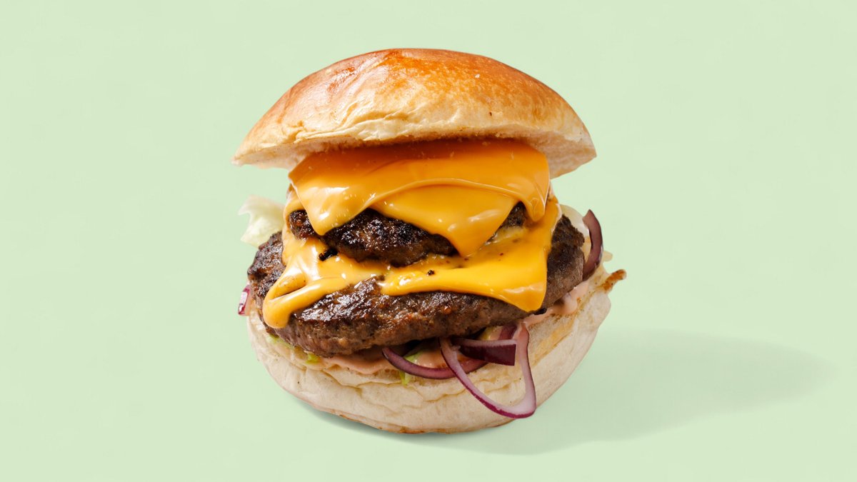 mit zerdrückten doppelten Rindfleischpatties, Cheddar, Zwiebeln und Spezialsoße