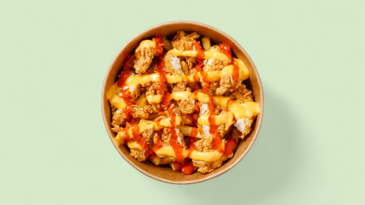 mit knusprigen Pommes frites, knusprigen Hähnchenstücken, veredelt mit cremig geschmolzener Cheddar-Käsesoße und einer speziell, feurig-würzigen scharfen Soße