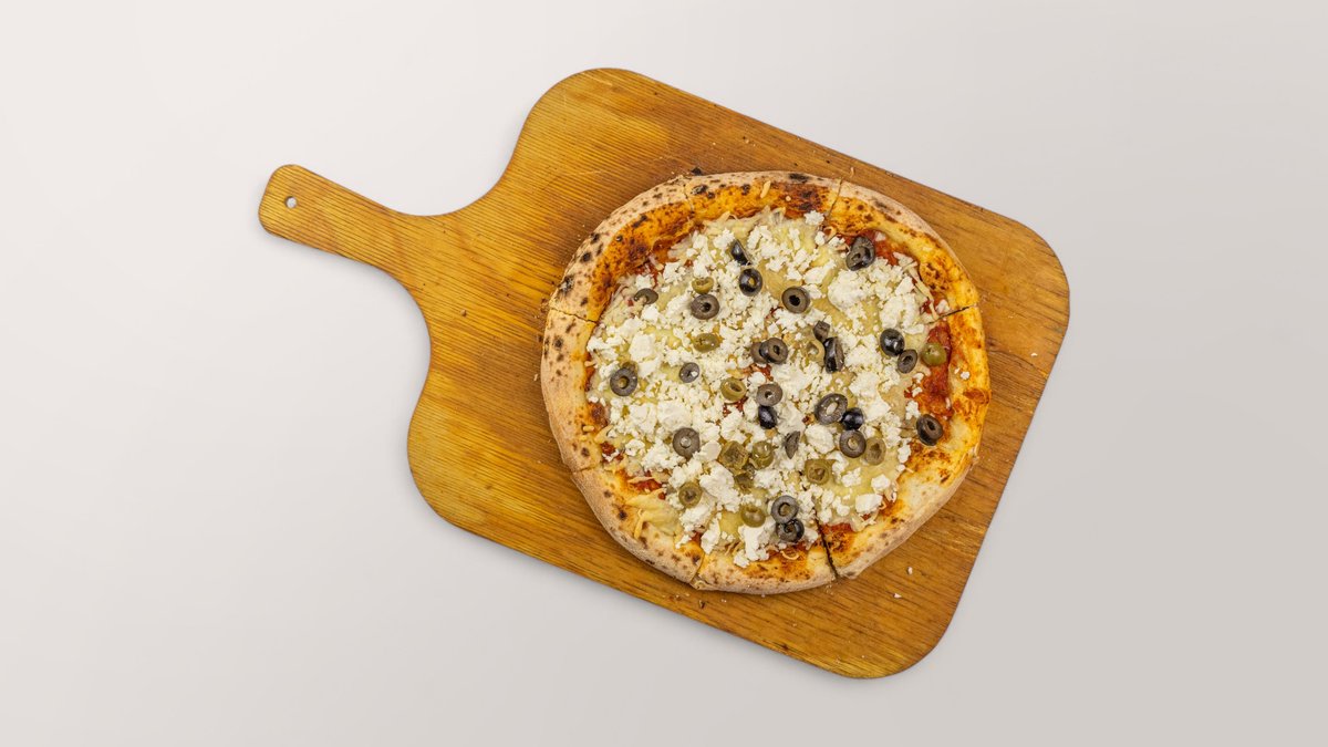 mit Tomatensoße, Hirtenkäse, Rucola und Oliven