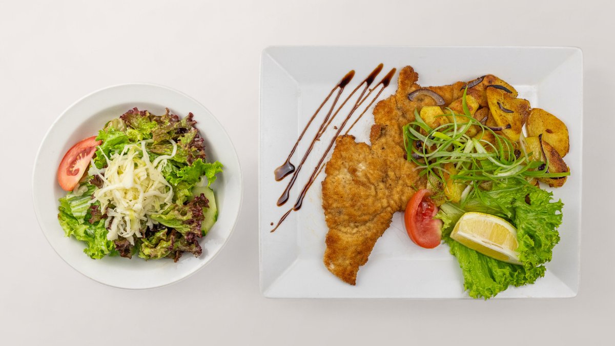 gemischter Salat mit Champignons, Tomaten, Zwiebeln, Gurken und einer Zutat nach Wahl, dazu unser Hausdressing