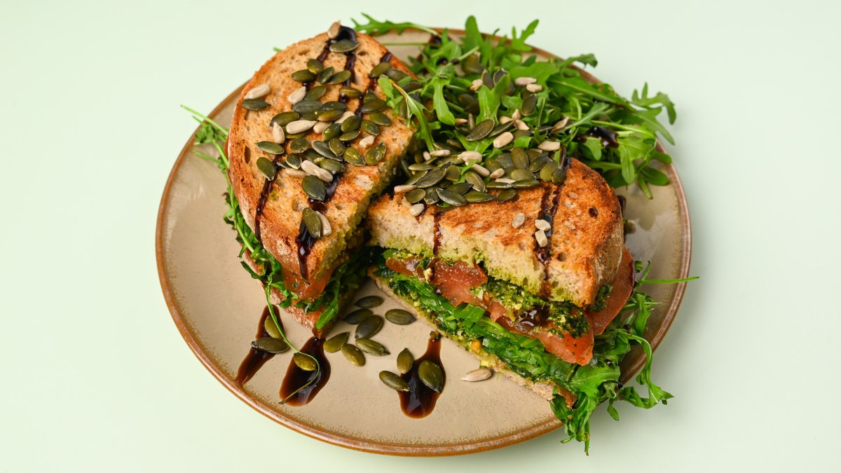 with avocado, pumpkin seeds and pesto