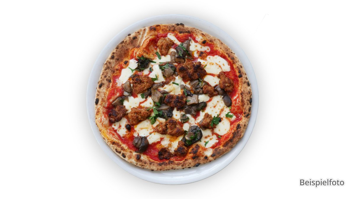 mit Tomatensoße, Mozzarella, Hinterschinken, Salami und frischen Pilzen