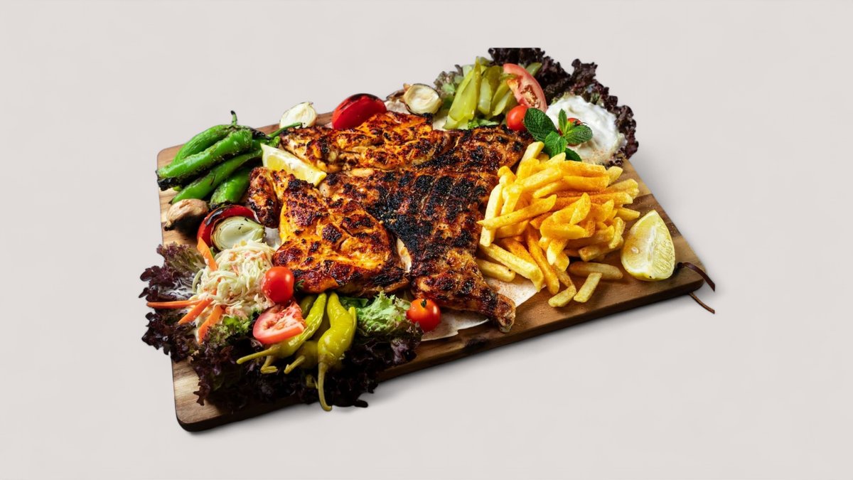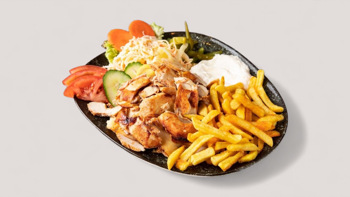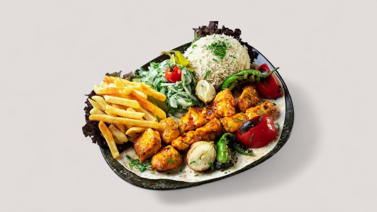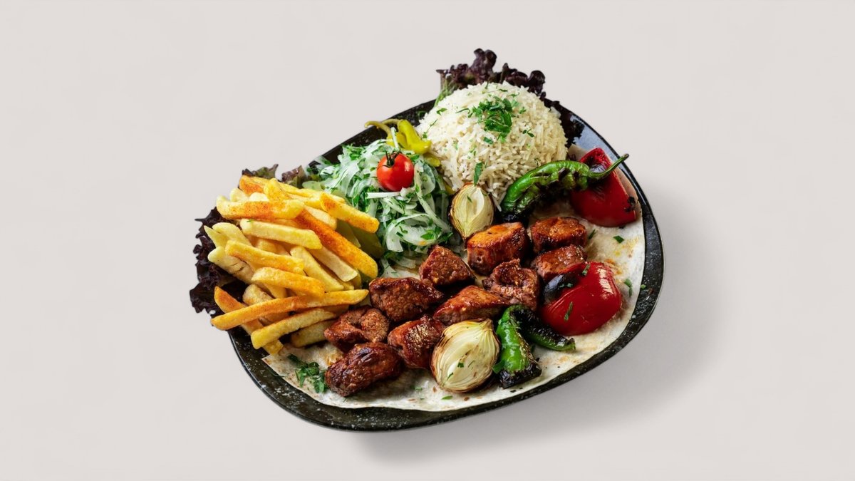 tender marinated, grilled lamb with grilled vegetables, spicy chili bread, fresh salad, rice and crispy French fries