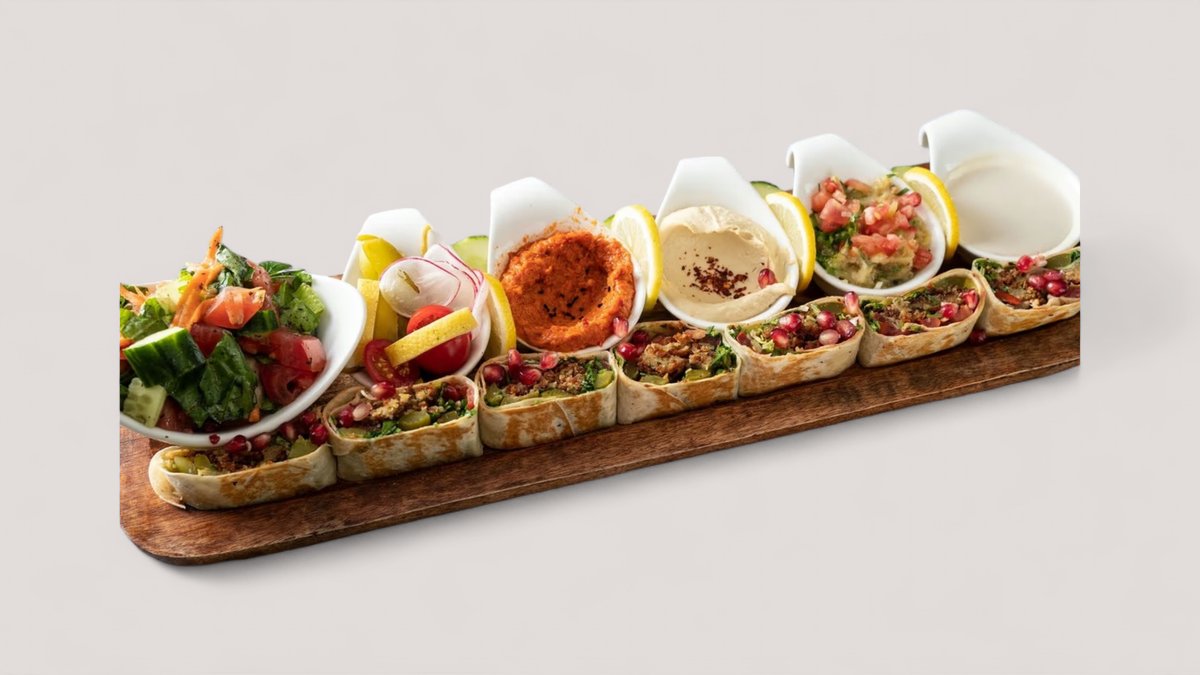 Mixed starter platter, a delicious 4-course combination of the highlights of Arabic cuisine. Experience the creamy pleasure of hummus, muttabal, baba ghanoush and muhammara, accompanied by warm flatbread, freshly prepared in our traditional tandoori oven.