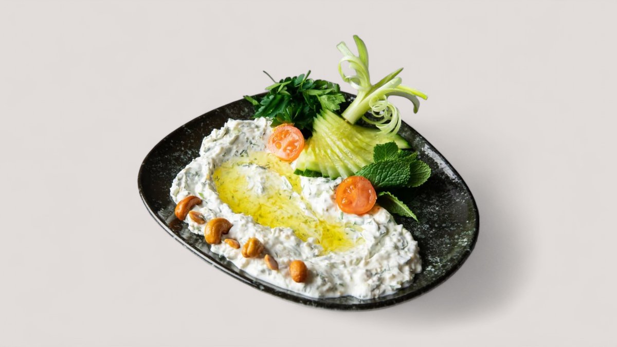 a creamy eggplant puree with rich sesame paste, refreshing yoghurt, aromatic garlic, a hint of lemon juice and juicy pomegranate seeds