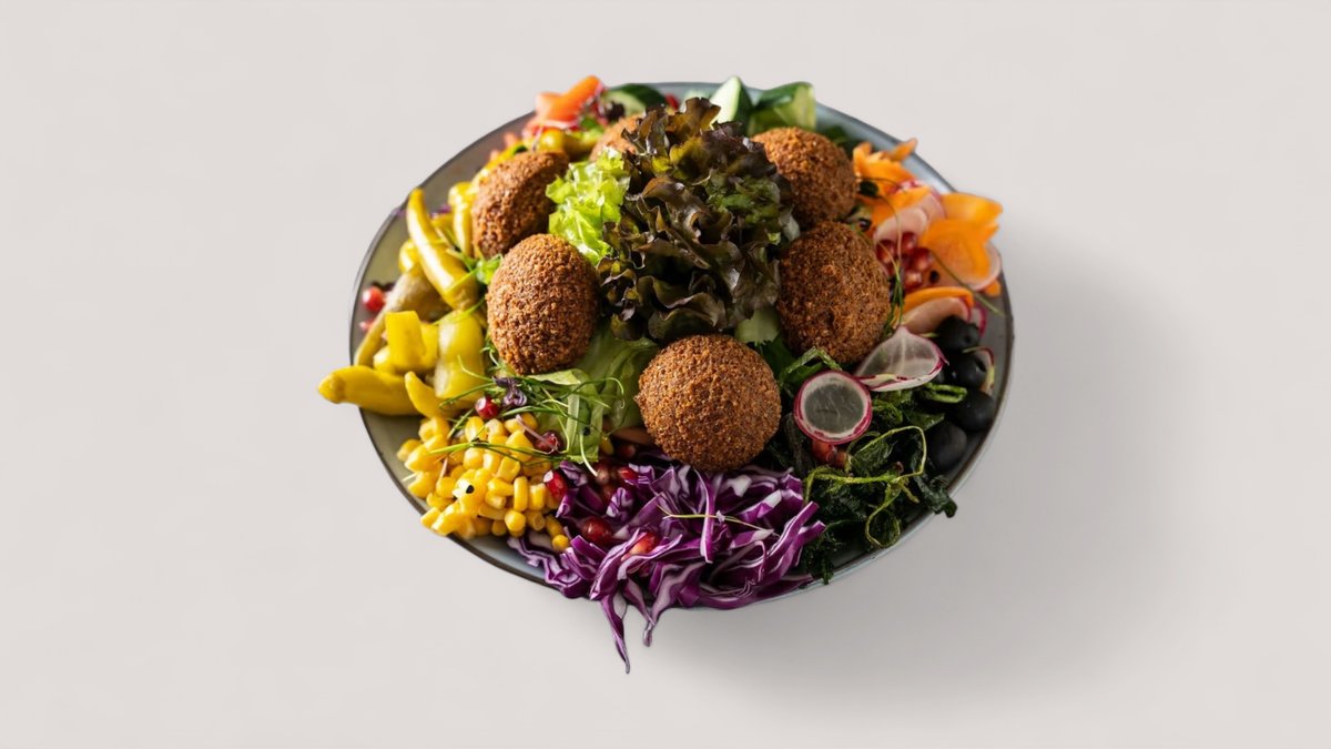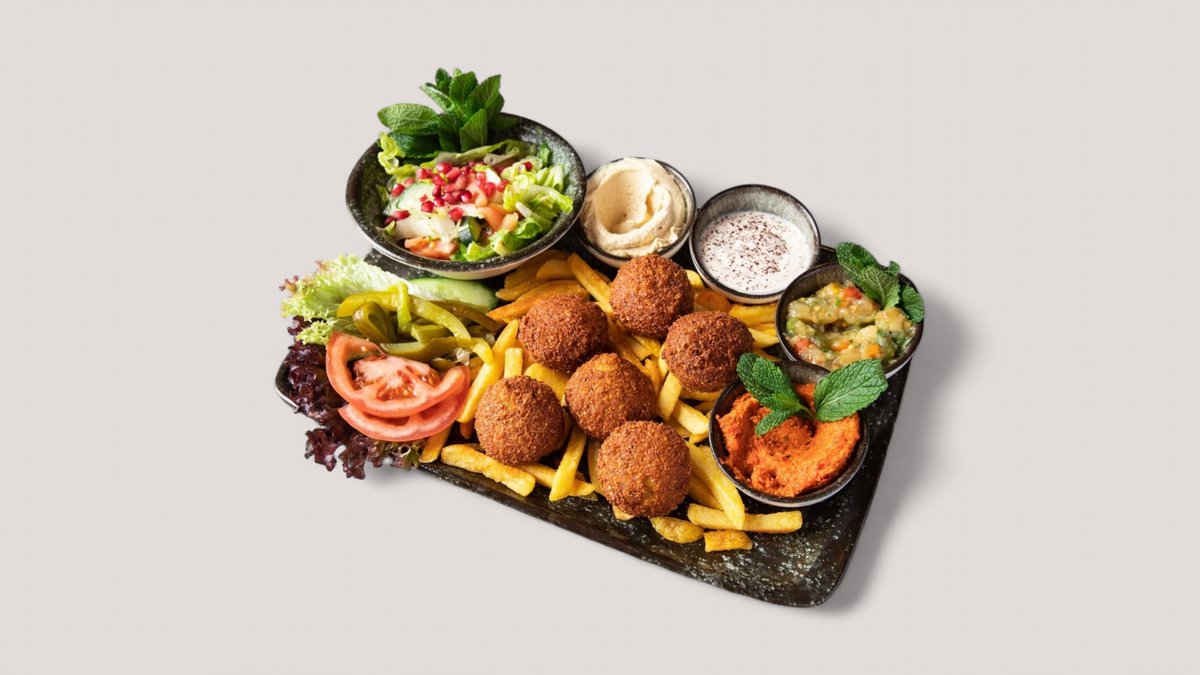 fried chickpea balls, crispy on the outside and wonderfully tender on the inside with three dips, fresh salad, pickled vegetables and a side dish of your choice
