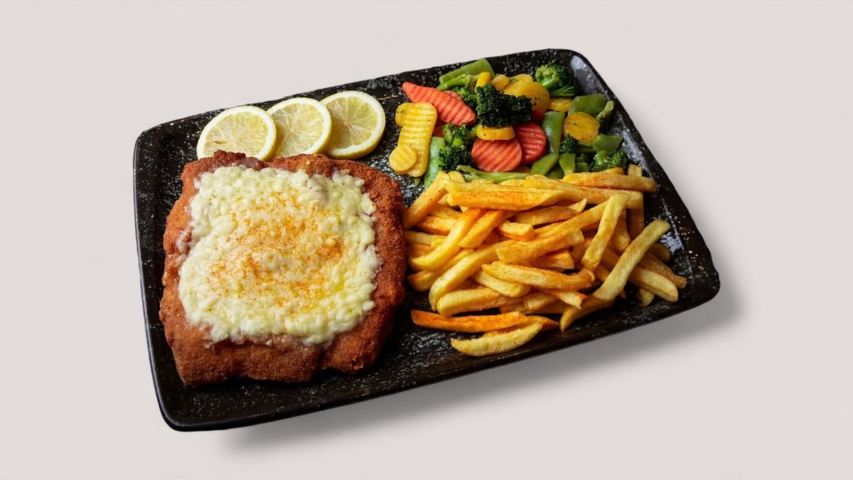 Chicken breaded & gratinated with cheese. Served with fresh lemon slices, steamed vegetables, crispy fries, homemade coleslaw and a garlic dip