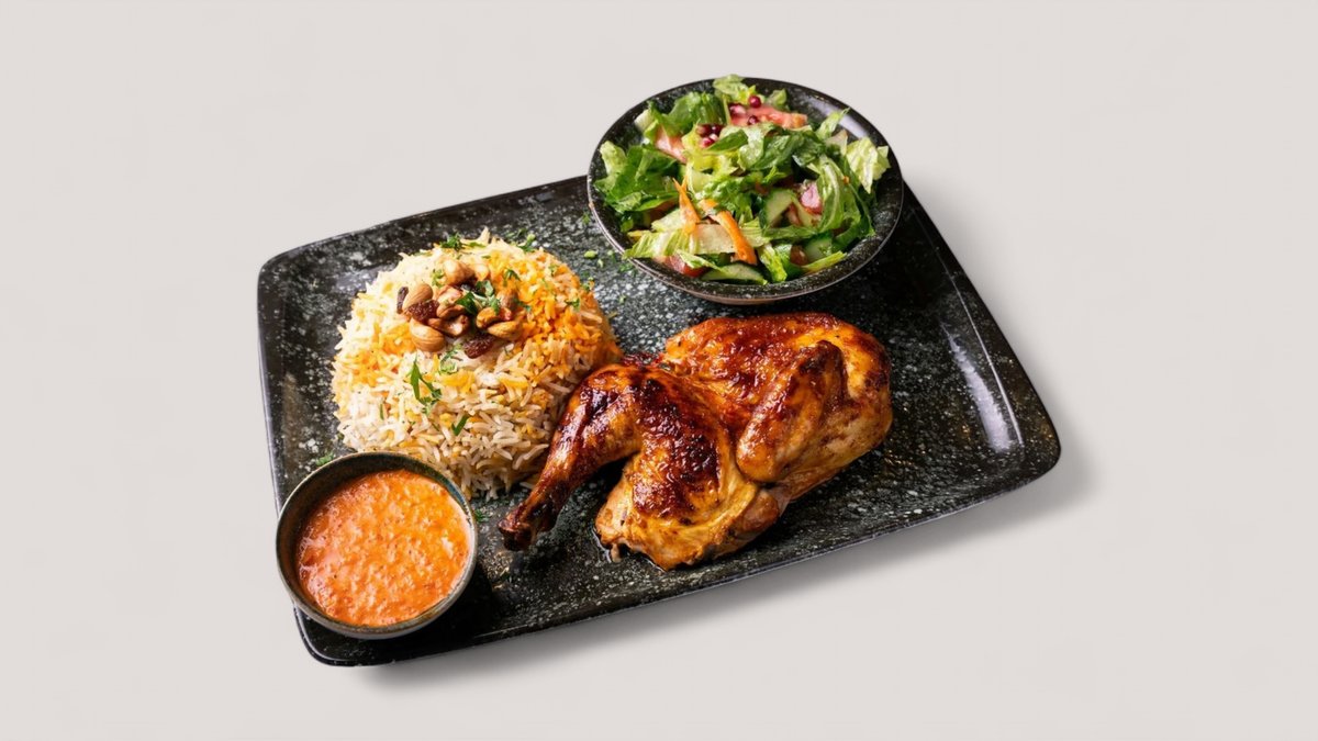 with half a chicken, basmati rice, fresh vegetables, vermicelli, nuts and side salad