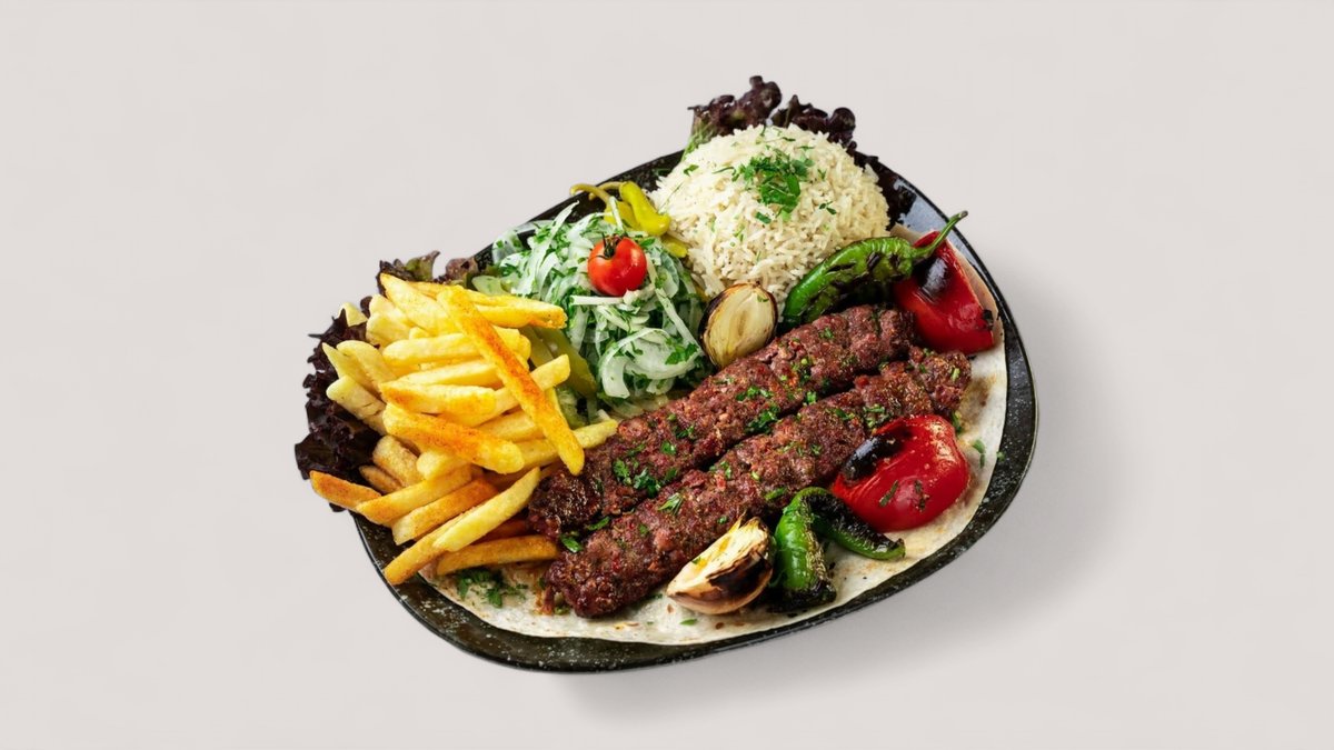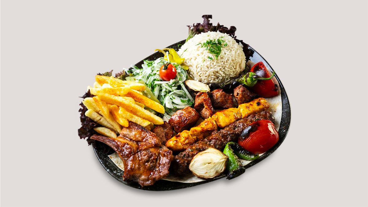 with juicy tikkah lamb skewer, a tender lamb chop, a spicy shish tavuk, a hearty kafta skewer, grilled vegetables, chili bread, rice and crispy French fries