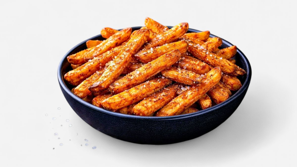 SĂĽĂźkartoffel-Pommes in Ă–l frittiert