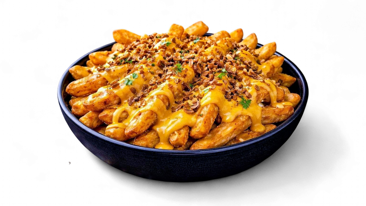 Pommes frites mit Käse und Röstzwiebel-Soße