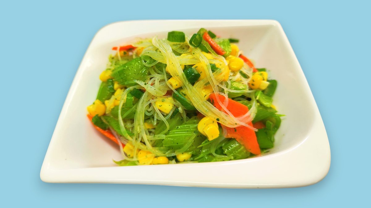 Staudensellerie Salat mit Karotten, Glas Nudeln, Mais, Lauchzwiebeln