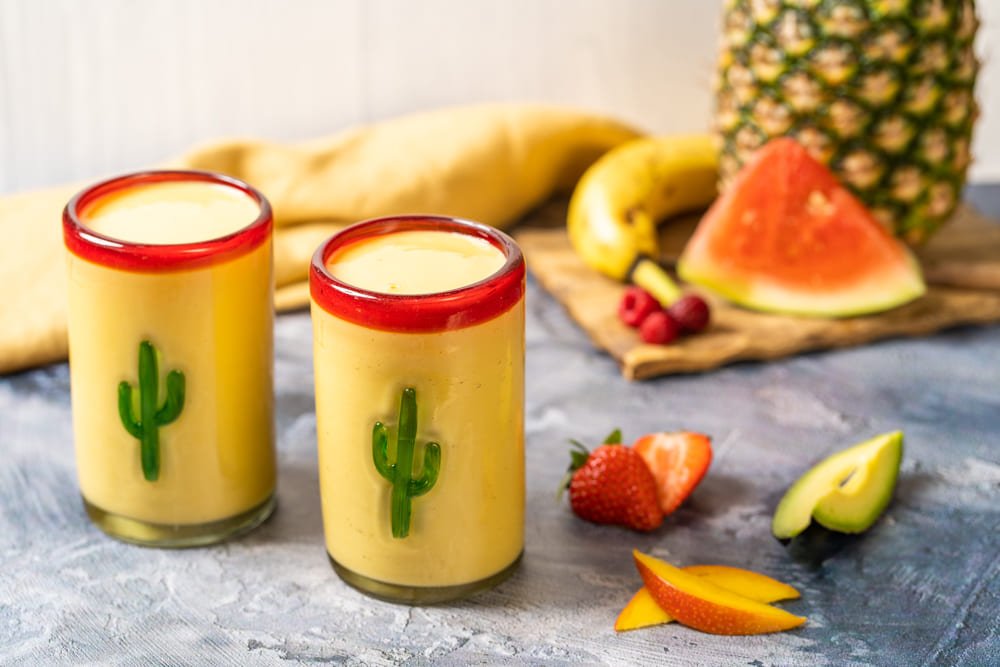 mit weißem Rum, Ananassaft, Kokossirup, Sahne, Mangostücken und Mangosirup