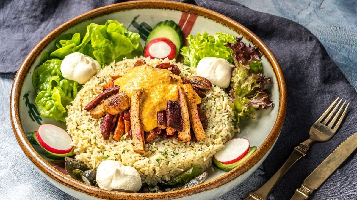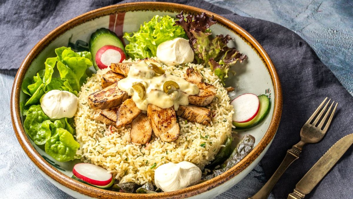 gefüllt mit spanischem Reis, gegrilltem Hähnchenbrustfilet, garniert mit Eisbergsalat, Tomatenstücken, Sauerrahm und einer Zutat deiner Wahl