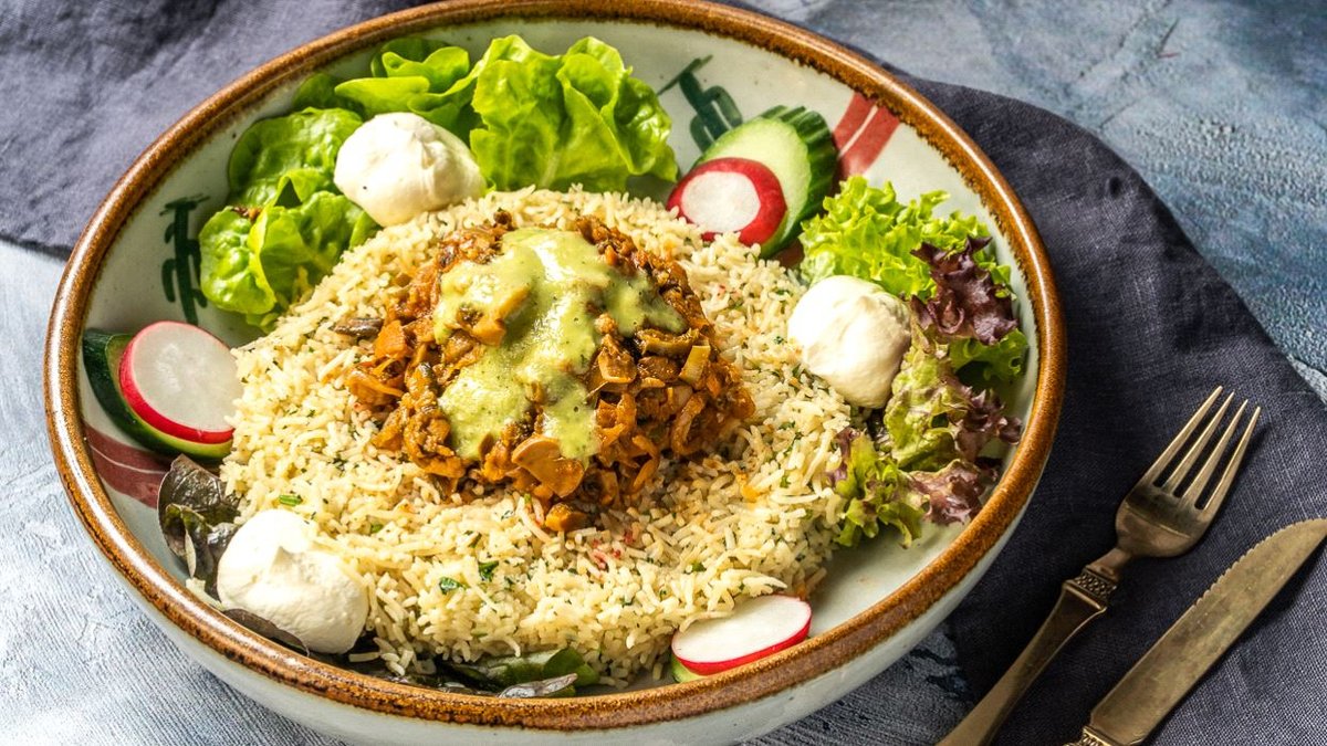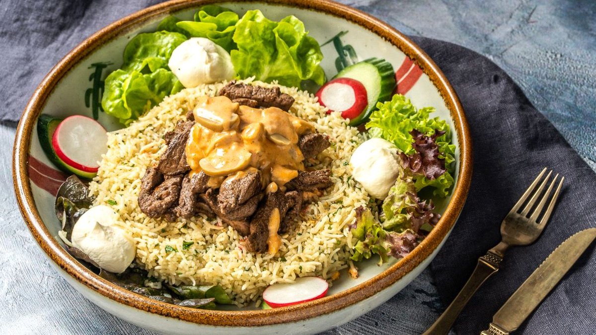 scharf mit gegrillten, marinierten argentinischen Rindfleischstreifen, sautiert in hausgemachten Chili-Champignon-Soße und mexikanischem Koriander-Limetten-Reis