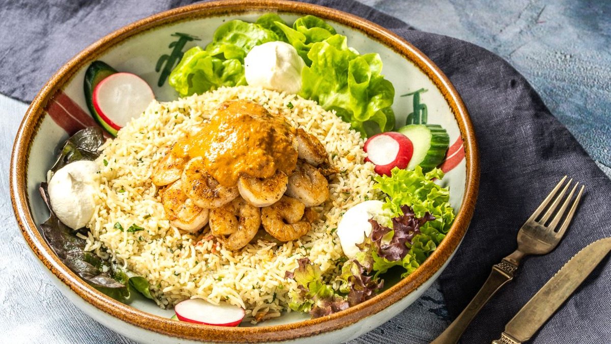 scharf gefüllt mit spanischem Reis, gegrillten Jumbo-Shrimps, bedeckt mit hausgemachter Chipotlesoße, garniert mit Eisbergsalat, Tomatenstücken und Sauerrahm