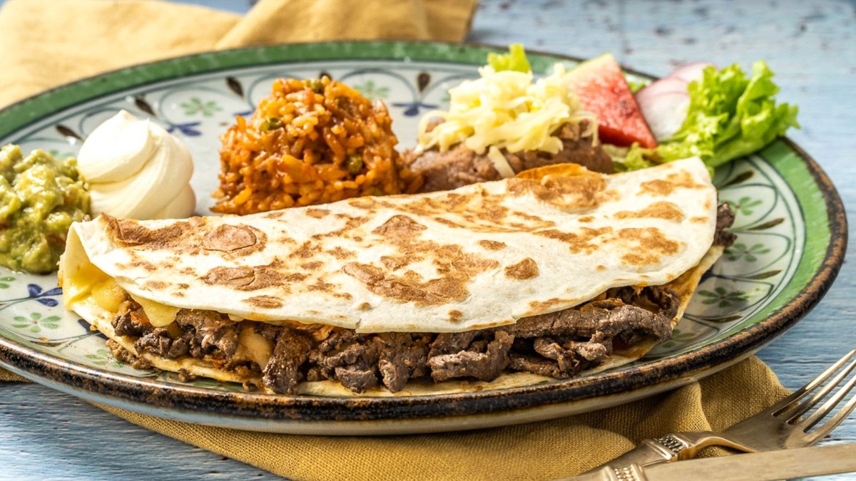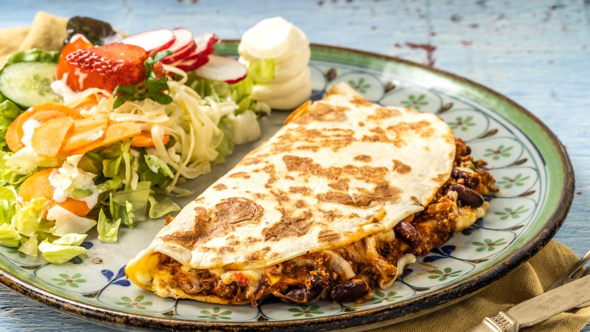 knusprig gegrillte Weizentortilla gefüllt mit geschmolzenem Käse, Salsa, einer Fleischsorte und einer Beilage deiner Wahl