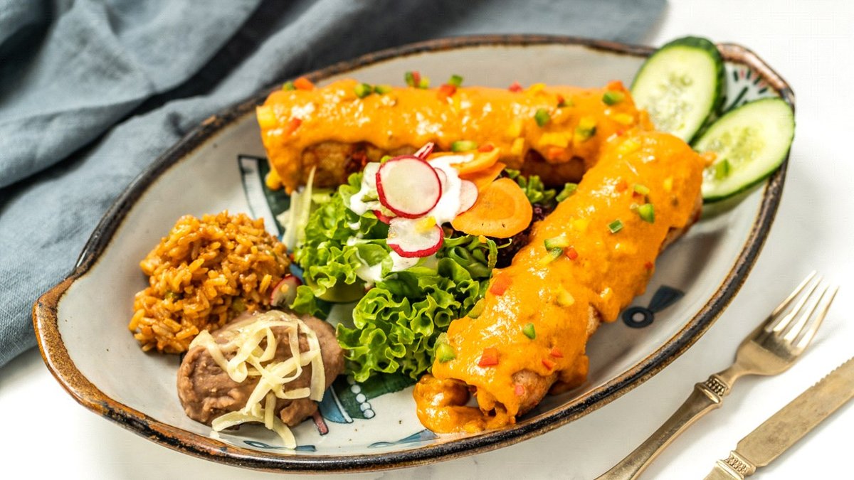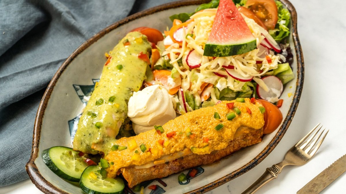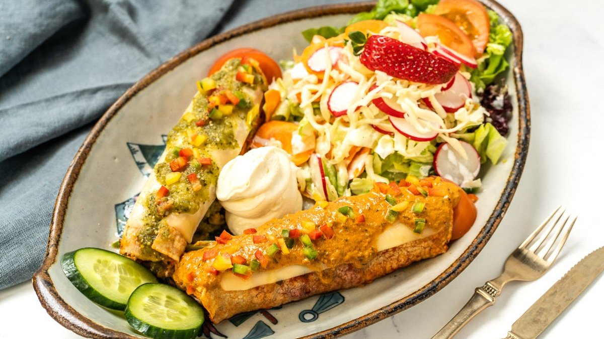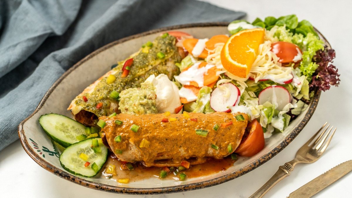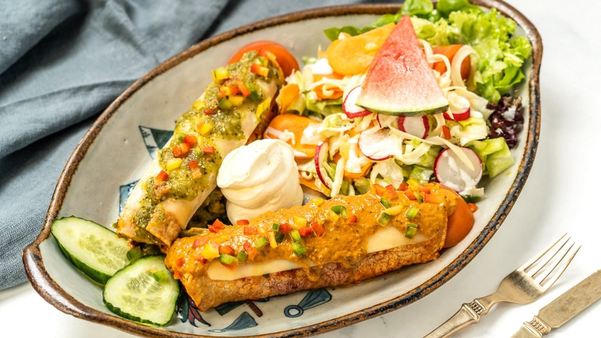 scharf mit 1x Spinat-Enchilada überzogen mit Avocado-Soße, 1x Auberginen-Enchilada überzogen mit Chipotlesoße, 1x Exotico-Enchilada bedeckt mit Erdnusssoße, garniert mit Paprika und in einer Zubereitungsart deiner Wahl
