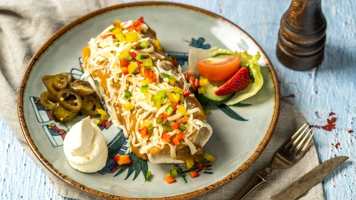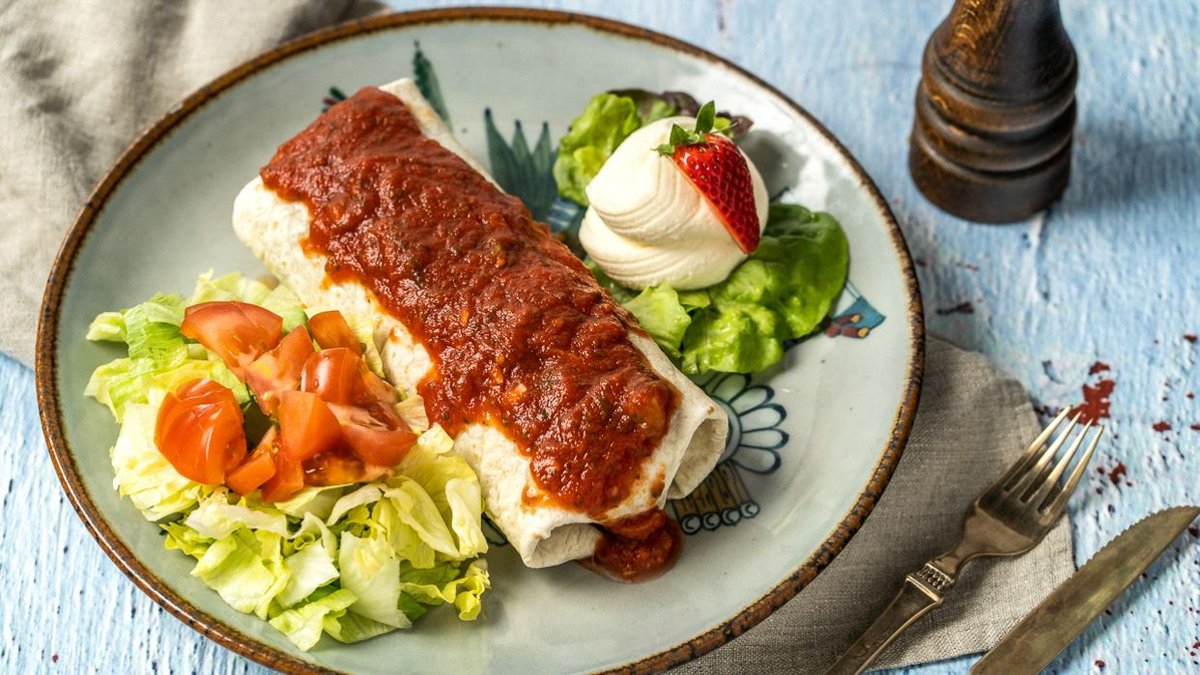 gefüllt mit einer Fleischsorte deiner Wahl, Käse und mexikanischen Bohnen, überzogen mit Salsa und garniert mit Eisbergsalat, Tomaten und Sauerrahm