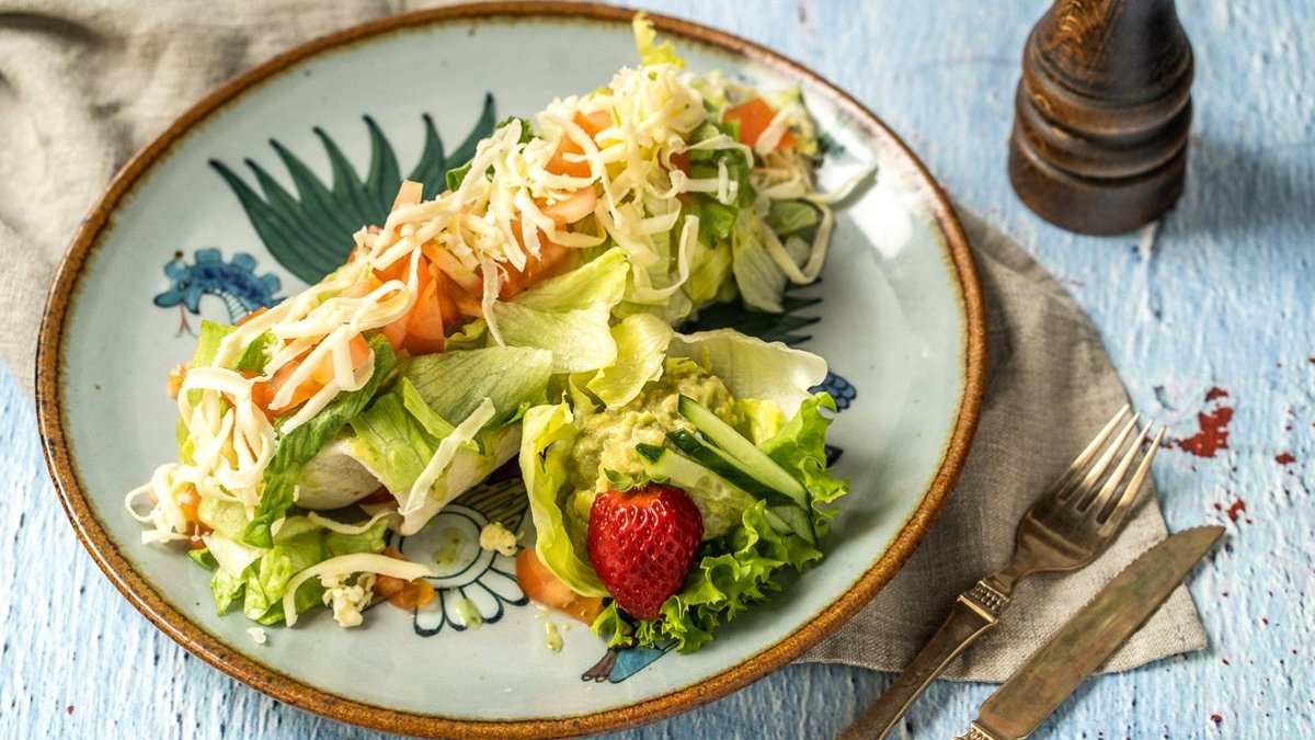 gerollte Maistortillas mit hausgewürztem Hähnchenfleisch, knusprig frittiert, serviert mit Pico de Gallo, garniert mit Paprika, Sauerrahm, Eisbergsalat und in einer Größe deiner Wahl