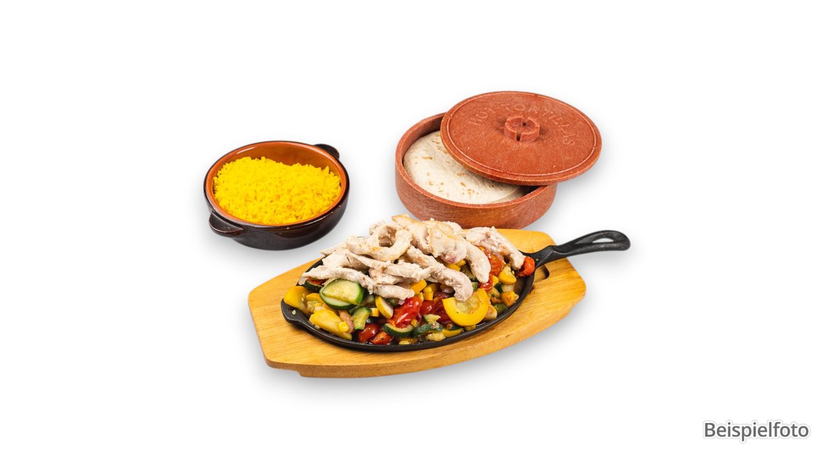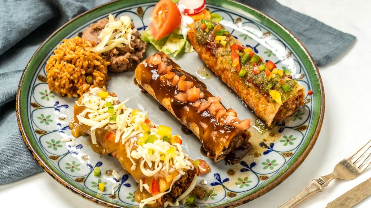 scharf 1x Enchilada mit pikantem Hähnchenfleisch und mit Salsa Verde überzogen 1x Enchilada mit geschnetzeltem Rindfleisch, bedeckt mit Asa-da-Soße 1x Enchilada mit würzigem Rinderhack, bedeckt mit Poblano-Soße, serviert mit Reis und Bohnen, garniert mit Paprika, geriebenem Käse, Eisbergsalat und Tomatenstücken