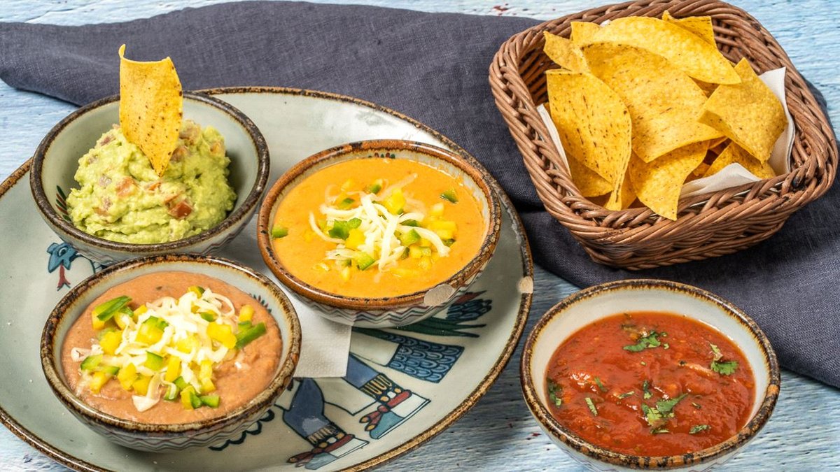 1x Frijoles (Bohnenpüree) 1x Guacamole (Avocadocreme) 1x Chili con Queso (Käsecreme) warme Chips hausgemachte Salsa deiner Wahl