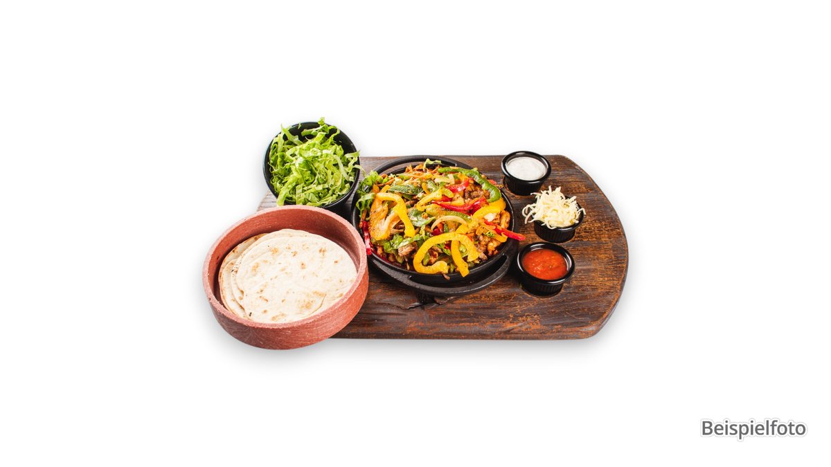 knusprig gegrillte, große Weizentortilla, mit Paprika, Zwiebeln, Eisbergsalat und Tomaten, garniert mit Guacamole, Sauerrahm und Salsa, serviert mit einer Zutat deiner Wahl