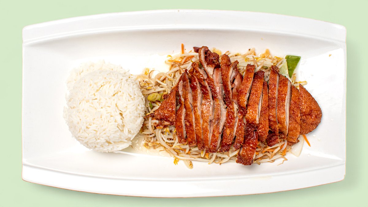 crispy grilled Peking duck with EAST coconut-lemon sauce and fresh market vegetables